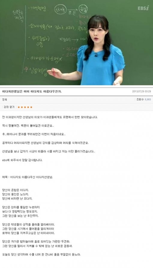 '마이리틀텔레비전' 이다지가 뜨거운 관심을 받고 있는 가운데, 그녀를 위한 한 학생의 헌정시가 눈길을 끌고 있다.지난 2013년 7월 29일 한 수강생은 인터넷 커뮤니티를 통해 "선생님은 어이 이다지도 아름다우신가'라는 제목으로 재치있는 헌정시를 남겼다.그는 "당신의 존함은 이다지. 당신의 용안은 노다지. 당신에 비하면 난 쪼다지/당신은 천하를 통일한 누르하치보다 더 영향력있는 명모호치. 그런 당신을 보는 난 후안무치/당신은 학생들의 성적을 올려줄 엘리베이터. 그런 당신을 시기해서 물어뜯을 엘리게이더로부터 당신을 지켜주고싶은 난 터미네이터"라는 글을 게재했다.이어 "당신은 차가운 밤하늘 아래 홀로 피어있는 가련한 두견화. 그런 당신을 멀리서 지켜볼 수 밖에 없는 난 외로운 접동새/오늘도 당신 생각하며 수풀 너머 흰 잔나비 울음 부질없이 듣노라"라고 덧붙이며 헌정시를 완성했다.이다지는 EBS에서 역사를 담당하고 있는 강사로 빼어난 미모뿐만 아니라 청소년들의 눈높이에 맞춘 강의로 이미 학생들 사이에서 유명하다. 그녀는 이화여대 사학과를 수석으로 졸업했으며, 한 금융공기업에 근무하다 임용시험을 준비해 합격한 엄친딸이다.한편, 지난 16일 방송된 MBC '마이리틀텔레비전'에서는 'MLT-02 두 번째 이야기' 대결이 펼쳐진 가운데, 김구라는 이다지 강사를 초청해 역사에 대한 다양한 이야기를 나눴다.['마이리틀텔레비전' 이다지, 사진=EBS 홈페이지]