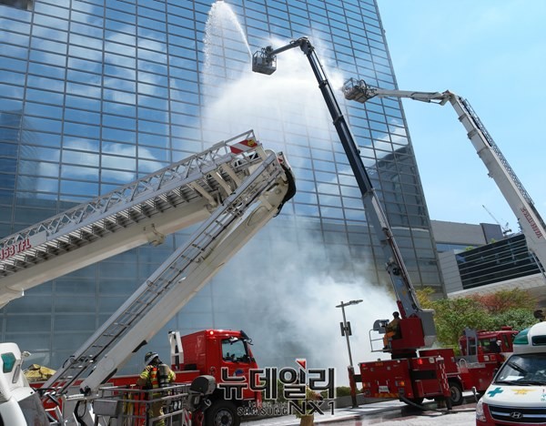 ]이 20일 오후 서울 강남구 트레이드타워에서 진행됐다. 이날 훈련에는 시민 1,300여명이 화재를 가정해 실제 대피했고, 인명구조와 화재진압, 수습복구 등을 진행했다.