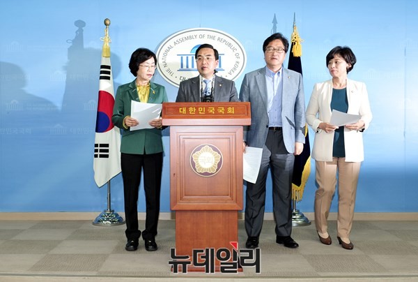 새정치민주연합 김상희, 박홍근, 우원식, 남인순 의원 등 초,재선 의원들이 20일 오후 국회 정론관에서 기자회견을 갖고 재안철수 전 공동대표에게 문재인 대표가 제안한 혁신위원장직을 맡아 줄 것을 호소하고 있다.