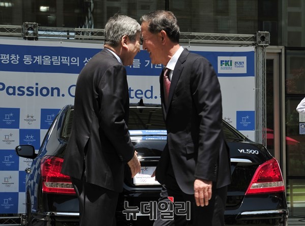 허창수 전국경제인연합회 회장과 평창동계올림픽 조양호 조직 위원장이 21일 전경련 타워에서 평창올림픽의 성공적인 개최를 기원하는 차량 스티커 부착 행사를 갖고 있다.이날 행사에는 허창수 회장과 조양화 위원장을 비롯해 스피드스케이팅 선수 이승훈, 모태범이 참석해 자리를 빛냈다. 전경련은 2만 장의 평창동계 올림픽 성공 기원 스티커를 정부와 주요 기관에 배포할 예정이다.