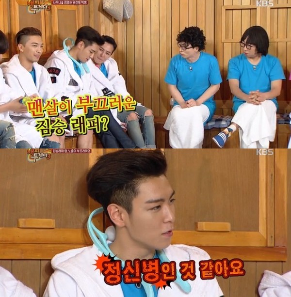 21일 방송된 KBS 2TV '해피투게더'에서 탑은 맨살 노출에 대한 숨겨진 이야기를 밝혔다.