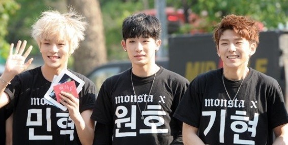 그룹 몬스타 민혁, 원호, 기연이 KBS 2TV '뮤직뱅크' 리허설에 참석하고 있다.