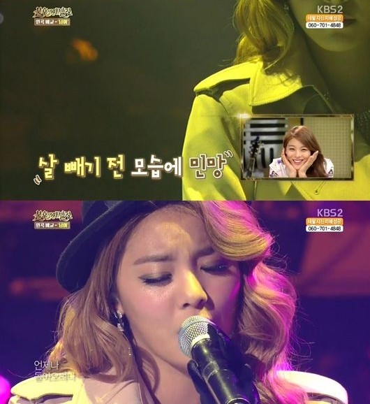 가수 에일리가 다이어트 전 자신의 모습을 보고 경악했다.에일리는 지난 21일 방송된 KBS2 예능프로그램 '불후의 재발견'에서 박기영 이정과 함께 출연, ‘불운의 명곡’편으로 꾸며졌다.이날 방송에서 에일리는 ‘불후의 명곡’에서 선보인 펄시스터즈의 ‘님아’무대 영상을 감상했다. 이어 그는 자신의 모습을 보더니 민망해 하며 “안 된다. 누구냐 저 돼지는”이라고 자신에게 독설을 날려 웃음을 자아냈다.앞서 에일리는 한 프로그램에서 "10kg을 감량했다”며 “한 끼에 단백질 100g, 채소 2컵, 과일 1개를 먹는 등 식단 조절을 많이 했다”고 밝힌 적 있다.한편 '불후의 재발견'은 '불후의 명곡'을 통해 재발견된 가수들의 음악 이야기와 비하인드 스토리를 담은 프로그램이다. 매주 목요일 오후 8시 55분 방송.