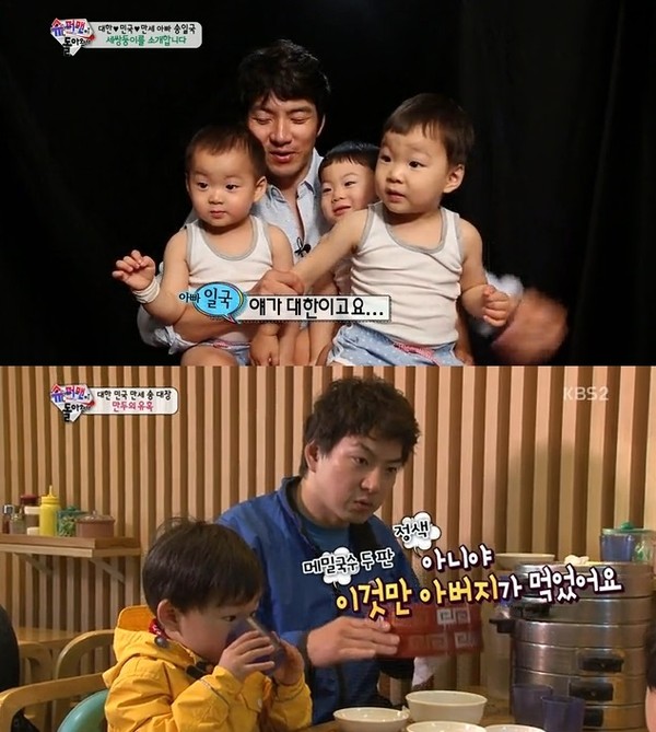 한편 송일국은 KBS 2TV '슈퍼맨이 돌아왔다‘에서 삼둥이와 함께 '폭풍 식성'을 드러내며 매회 ’국민 먹방‘을 선보이고 있다. 이에 그는 10kg 정도의 체중이 증가했다고 밝히며 다이어트를 선언했으나 매번 음식 앞에서 좌절하는 모습을 보여 시청자들의 웃음을 자아내고 있다.