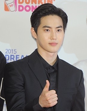 그룹 EXO의 수호가 23일 서울 마포구 성산동 서울월드컵경기장에서 개최된 '사랑한다 대한민국-2015 드림콘서트' 포토월 행사에 참석해 카메라를 향해 엄지손가락을 들어올리고 있다.