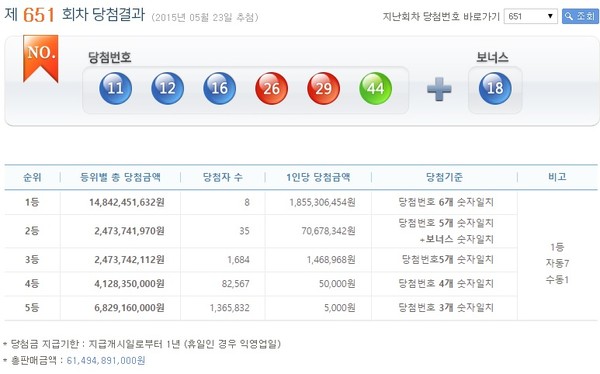 2015년 5월 23일 실시된 제651회 나눔로또 1등 당첨번호는 '11, 12, 16, 26, 29, 44'이며, 2등 보너스 번호는 18번이다.이번 로또 651회차 추첨 결과 1등 당첨자는 5명으로 18억5530만6454원의 당첨금을 받게 됐다.1등 번호 중개와 보너스 번호를 맞힌 2등은 35명이며, 1인당 7067만8342원씩 지급받는다. 당첨번호 중 5개를 맞힌 3등은 1684명으로 당첨금은 각 146만8968원이다.5만원의 당첨금을 받는 4개의 번호를 맞힌 4등은 8만2567명이며, 5000원의 고정 당첨금을 받는 5등은 136만5832이 나온 것으로 집계됐다.한편, 이번주 로또651 총 판매금액은 614억9489만1000원이다.[로또651회당첨번호, 사진=로또 홈페이지 캡처]