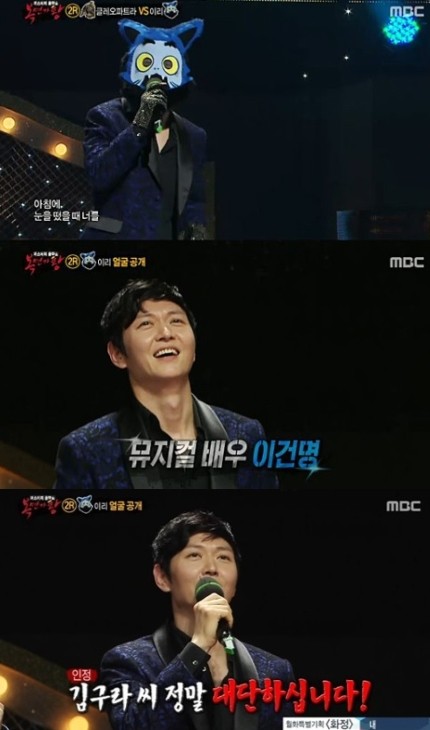 '복면가왕' 이리 정체는 뮤지컬 배우 이건명으로 드러났다.24일 방송된 MBC '일밤-복면가왕'에서는 육중완, 홍석천, 배다해, 소진을 꺾고 준결승전에 진출한 막강한 실력의 복면가수 4인의의 대결이 그려졌다.이날 두 번째 대결에서는 '화생방실 클레오파트라'와 '이리와 함께 춤을'(이하 '이리')이 4대 가왕전을 놓고 맞붙었다.'화생방실 클레오파트라'는 노을의 '만약에 말야'를, '이리와 함께 춤을'은 윤도현의 '잊을게'를 선곡해 뛰어난 가창력을 선보였다. 결국 '이리와 함께 춤을'은 화생방실 클레오파트라에 밀려 3라운드 진출에 실패했다.가면을 벗은 '이리'의 정체는 뮤지컬배우 이건명. 그는 "놀다 가는 것 같아서 기쁘다. 뮤지컬 배우로 생각 못하고 록커 얘기가 나왔다. 나로서는 그게 짜릿했다"고 출연 소감을 밝혔다.['복면가왕' 이건명, 사진=MBC '복면가왕' 방송 캡처]