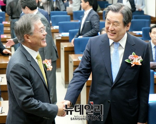새누리당 김무성 대표와 새정치민주연합 문재인 대표가 28일 오전 서울 여의도 국회도서관에서 열린 국회 [광주유니버시아드대회 지원단 발대식]에서 인사를 나누고 있다.
