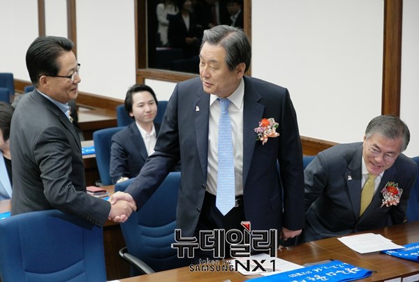 새누리당 김무성 대표와 새정치민주연합 박지원 의원이 28일 오전 서울 여의도 국회도서관에서 열린 국회 [광주유니버시아드대회 지원단 발대식]에서 인사를 나누고 있다.