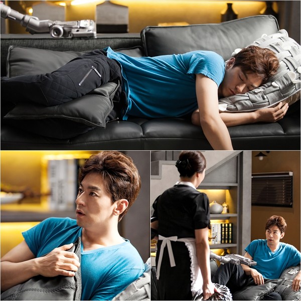 공개된 사진 속 주진모는 파란색 티셔츠에 검은 색 트레이닝복을 입고는 소파에 늘어져 잠을 자고 있다. 이 때 청소기를 든 가사도우미가 등장해 주진모를 깨우기 시작했고, 이에 주진모는 쿠션을 끌어안은 채 화들짝 놀란 표정을 지었다.