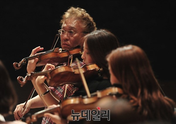 사단법인 서울오케스트라가 29일 오후 서울 영등포구 여의도 KBS홀에서 열린 [문화 나눔의 밤]공연에 앞서 연습 연주를 하고 있다.