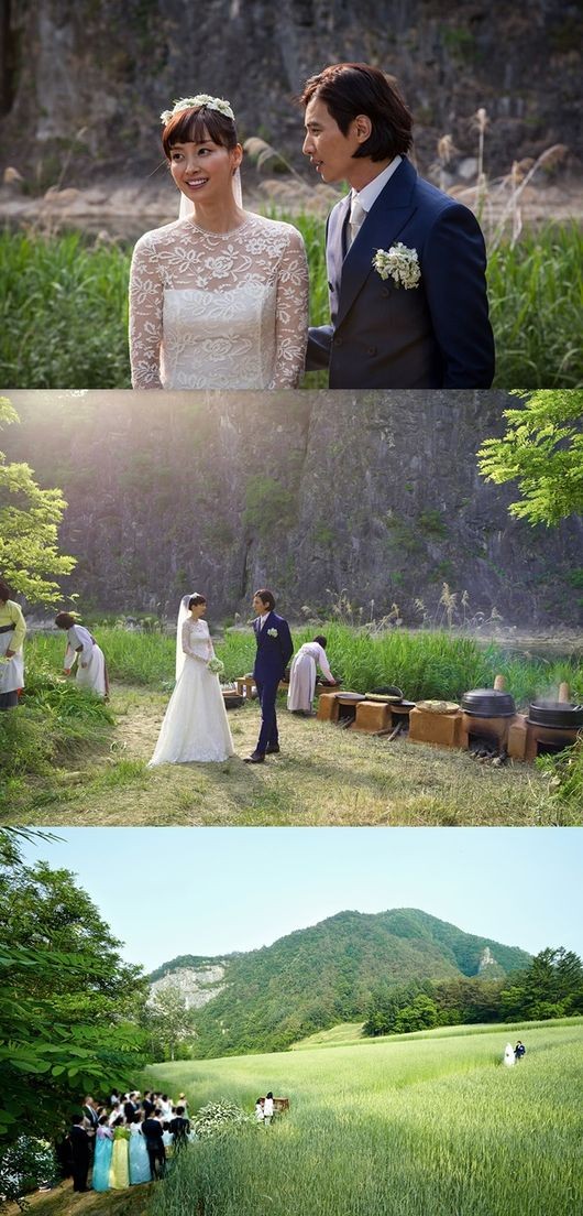 배우 원빈과 이나영의 그림 같은 결혼식 사진이 공개됐다.소속사 이든나인 측은 5월 31일 공식 홈페이지를 통해 전날 치러진 원빈 이나영 커플의 이색적인 결혼식 사진을 게재했다.두 사람은 지난 30일 오후 강원도 정선군 화암면 북동리 덕산기 계곡 인근에서 극비 결혼식을 올리고 부부의 연을 맺었다.공개된 사진에는 푸른 산과 들판을 배경으로 삼아 동시 입장하는 원빈 이나영의 행복한 모습이 담겨 있다. 또, 서로를 바라보며 이야기를 나누는 두 사람의 우월한 비주얼이 눈에 띈다.가까운 친인척 50여 명과 함께 결혼식을 끝낸 후 초원 위에 가마솥을 걸고 국수를 끓이는 조촐한 피로연 장면도 시선을 사로잡는다.예식은 결혼식을 올린 들판의 인근에 위치한 민박집에서 준비했으며, 이나영의 웨딩드레스는 10년 이상 친분을 맺고 있는 디자이너 지춘희가 만들었다.한편, 원빈 이나영 부부는 각자 일정이 마무리되는 대로 신혼여행을 다녀올 계획이며, 신혼집은 서울 방배동 서래마을에 마련했다.[원빈 이나영 결혼 사진 공개, 사진=이든나인 홈페이지]