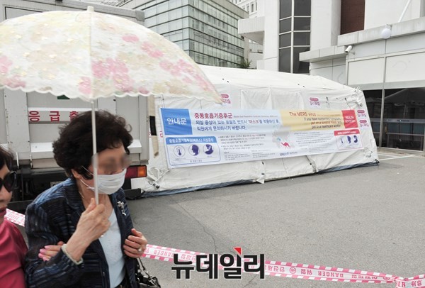 2일 오후 중동 호흡기 증후군(메르스) 의심 환자 격리 센터가 설치된 서울 종로구 모 대학병원 응급실 앞을 시민들이 지나고 있다.