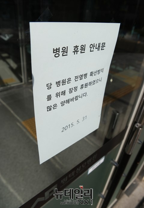 병원 입구에는 "당 병원은 전염병 확산방지를 위해 잠정 휴원하였으니 많은 양해를 바랍니다"라고 쓴 휴원 안내문을 걸었다. 3일 18시(현재) 메르스 확진 환자 수는 30명이다.