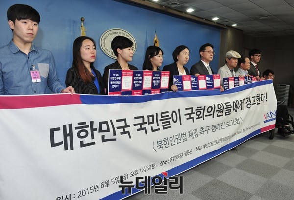 북한인권법 통과를 위한 모임(NANK, ow! Act for North Koreans!)이 5일 오후 서울 여의도 국회 정론관에서 북한인권법 제정을 촉구하는 기자회견을 갖고 있다.