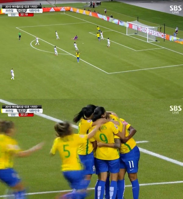 10일 오전 브라질과 2015 FIFA 여자월드컵 조별리그 1차전을 치르고 있는 여자월드컵 대표팀은 강호 브라질과 대응한 경기를 펼치고도 전반 33분 포로미가에게 선제골을 허용, 끌려가고 있다. 한국수비수의 실수가 골로 연결된 것.