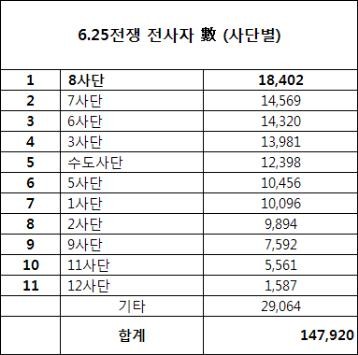 6·25전쟁 전사자 수 (출처: 국방부 군사편찬연구소)