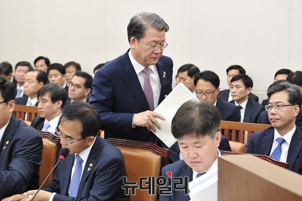 임환수 국세청장이 15일 오전 서울 여의도 국회에서 열린 기획재정위원회 전체회의에서 업무보고를 위해 단상으로 향하고 있다.