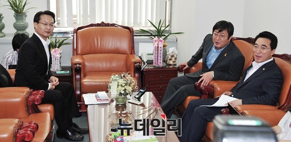 조해진 새누리당 원내수석부대표와 이춘석 새정치민주연합 원내수석부대표가 17일 오전 서울 여의도 국회에서 황교안 국무총리 후보자 임명동의안 처리 관련 논의를 하고 있다.