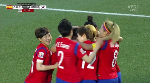 윤덕여 감독이 이끄는 한국 축구대표팀은 이날 오전 8시(한국시간) 캐나다 오타와 랜즈다운 스타디움에서 열린 2015 여자월드컵 E조 스페인과의 경기에서 후반 32분에 터진 김수연의 결승골로 2-1 승리를 했다.