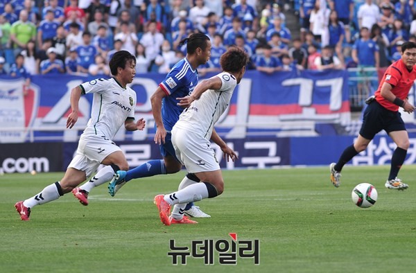 프로축구 1부 리그인 K리그 클래식 선두를 달리는 전북현대모터스와 2위를 달리고 있는 수원삼성블루윙즈가 21일 수원월드컵경기장에서 맞대결을 펼치고 있는 가운데 수원 정대세 선수가 전북의 수비를 따돌리고 있다.