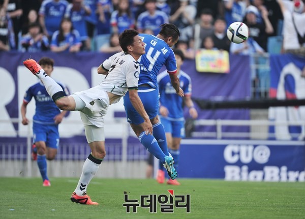 프로축구 1부 리그인 K리그 클래식 선두를 달리는 전북현대모터스와 2위를 달리고 있는 수원삼성블루윙즈가 21일 수원월드컵경기장에서 맞대결을 펼치고 있는 가운데 수원 정대세 선수가 전북의 수비를 따돌리고 헤딩을 하고 있다.