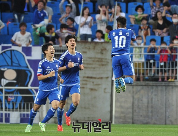 프로축구 1부 리그인 K리그 클래식 선두를 달리는 전북현대모터스와 2위를 달리고 있는 수원삼성블루윙즈가 21일 수원월드컵경기장에서 맞대결을 펼치고 있는 가운데 수원 선수들이 골을 넣은 산토스를 축하하고 있다.