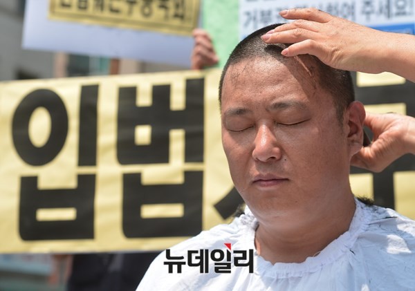 이들은 기자회견을 통해 박근혜 대통령에게 "삼권분립 훼손하는 위헌법률 거부권을 행사해 달라"며 삭발식을 진행했다.