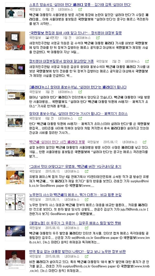 이같은 '병림픽' 열풍에, 유력 종합일간지 중에선 <국민일보>가 유일하게 동참했다. 횟수만 놓고 보면 가히 선두주자격이다. <국민일보>는 '살려야한다' 패러디 외에도 '박근혜 번역기' 등을 수차례 거론하며 '대통령의 격'을 떨어뜨리는 데 앞장섰다.