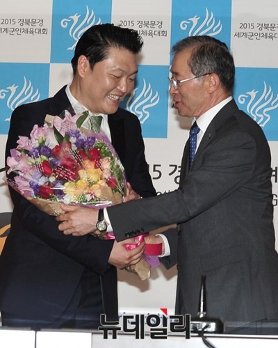 월드스타 싸이가 30일 오후 서울 용산구 국방 컨벤션에서 열린 '2015 경북 문경 세계군인체육대회 홍보대사 위촉식'에서 위촉패와 꽃다발을 전달받고 있다.