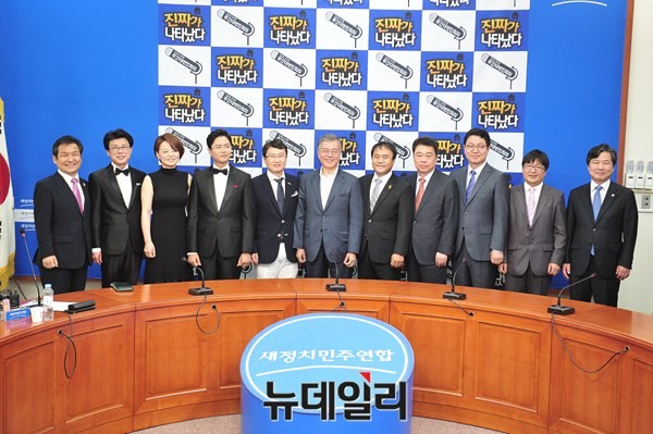 문재인 새정치민주연합 대표와 의원들이 2일 오후 서울 여의도 국회에서 열린 [진짜가 나타났다] 팟캐스트 제작 발표회에 참석해 기념사진을 촬영하고 있다.