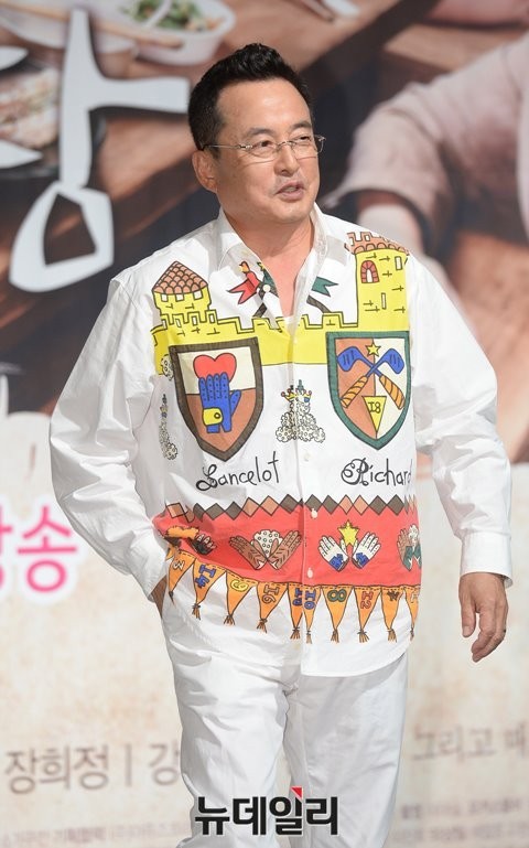 2일 오후 서울 라마다호텔서 진행된 SBS 토요일 심야 드라마 '심야 식당' 제작발표회가 열린 가운데 배우 정한헌이 프린트 무늬가 눈에 띄는 셔츠를 입고 입장하고 있다.