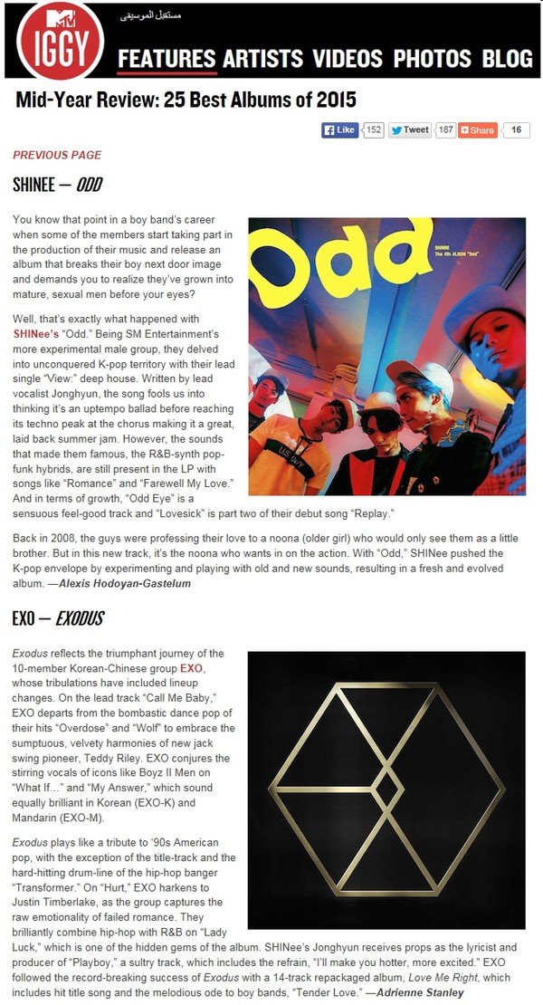 K-POP 리더 샤이니(SHINee)와 글로벌 대세 엑소(EXO)의 앨범이 MTV IGGY 선정 ‘2015년 상반기 베스트 앨범 25’에 나란히 등극해 화제다.