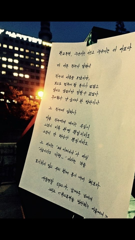먼저 7인의 작가로 선정된 것은 부끄럽습니다. 6인의 작가들이 있고 거기에 내가 보조로 들어간 것입니다. 운이 좋게도 '걱정하지 마라'라는 글귀를 적고 그것을 벽보에 붙였는데 그게 이슈가 됐습니다. 그것을 계기로 7인의 작가 대표님께서 제의를 주셨습니다.#.서울경찰청 스쿨피스 프로젝트는 뭔가요?