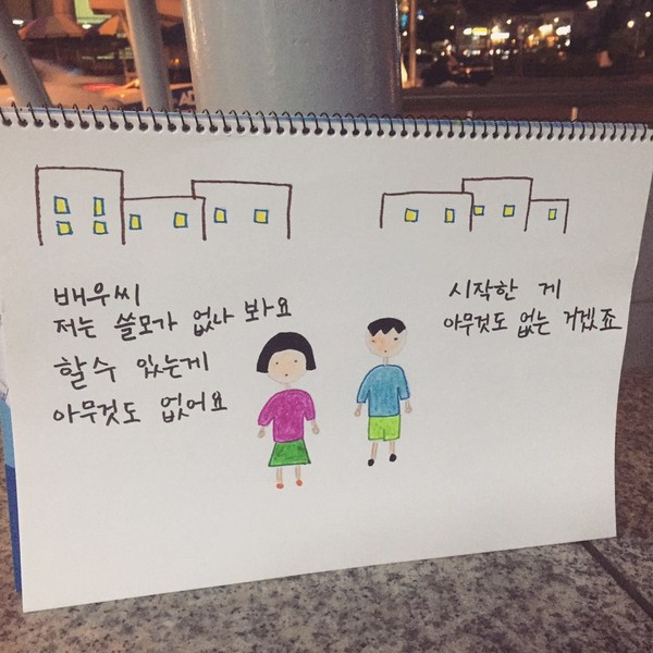 제가 쓰는 글은 사실 대단한 글이 아니라, 우리가 이미 알고 있는 문장이고 단어입니다. 하지만 사람들이 그 말에 열광하는 것은 자신 스스로에게 따뜻한 말을 하거나, 옆사람에게 듣거나 해줄 수 없는 말들이라서 그래서 제 글을 통해서 공감을 해주시는 거 같다.