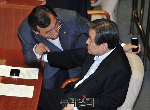 6일 오후 서울 여의도 국회에서 열린 본회의에서 [국회법 개정안]에 대한 재의결이 시작되자 새누리당 이정현 최고위원이 김무성 대표를 찾아 대화를 나누고 있다.