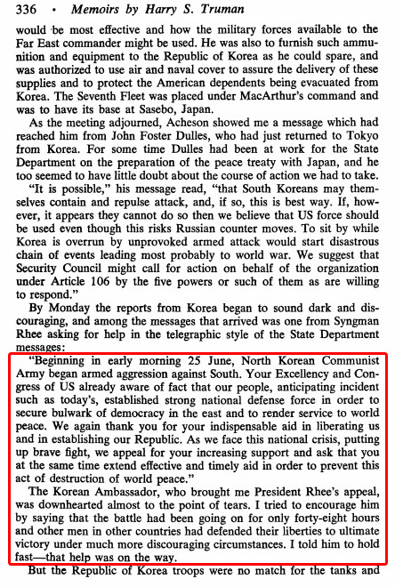 '6월25일 이른 아침부터 북한공산군은 남한에 대한 무장 침공을 개시하였습니다. 각하와 미국 의회도 잘 알다시피 우리 국민들은 이런 사태를 예상, 동양에서 민주주의의 보루를 구축, 세계 평화에 기여하기 위하여 강력한 국군을 만들었습니다. 우리는 귀하께서 우리를 해방하고 공화국을 건설하는 데 필수적인 도움을 주신 데 다시 한번 감사를 드립니다. 우리는 국가적 위기에 직면하였지만 용감하게 저항하고 있으니 세계 평화를 파괴하려는 책동을 저지하기 위하여 더 강력한 지지와 효율적이고 시의적절한 지원을 호소합니다.' 李 대통령의 호소문을 가져온 한국 대사는 낙담하여 울먹였다. 나는 전투가 겨우 48시간 지났을 뿐이고, 다른 나라들은 더 어려운 상황에서도 싸워서 종국적 승리를 거두어 자유를 지켜냈다고 말하여 그를 격려하였다. 나는 그에게 버티어내라면서 지원이 진행중이라고 했다.>KBS 도쿄 특파원은 바로 이날(6월27일) 이승만 정부가 일본에 망명 요청을 하였다는 보도를 하였는데, 일본의 한 지방 자료를 인용하면서 날짜를 조작한 것으로 밝혀졌다. 6월27일 이승만 대통령은 트루먼 대통령에게 결사항전을 다짐하고 군사적 지원을 요청하고 있었는데 일본으로 도망치려 하였다니! 어제 KBS 이사회는 '이승만 일본 망명 조작 보도 사건'에 대하여 논의를 하려고 하였더니 야당 추천 이사들이 방해하여 제대로 된 토의가 이뤄지지 않았다. 국영방송이 역사를 조작해놓고 그것을 시정하려는 노력을 방해한다면 이런 언론기관은 '펜을 든 조폭'보다도 못하다.트루먼 대통령의 회고록 2권 '시련과 희망(Trial and Hope)'(1946~1952) 中