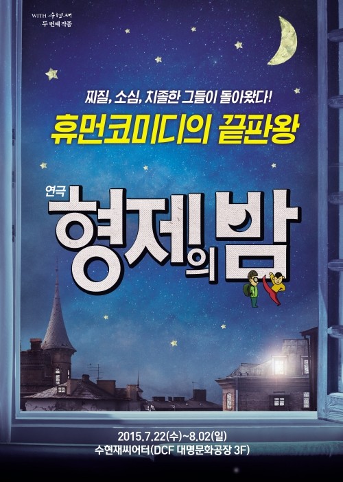 배우 조재현이 대표로 있는 수현재컴퍼니가 위드(WITH) 수현재 두 번째 작품으로 연극 '형제의 밤'을 선택했다.'위드 수현재' 시리즈는 예산과 인력 부족으로 사라져 가는 우수 작품을 개발해 보다 많은 관객과 만날 수 있는 장을 만들고자 하는 취지로 기획, 지난 2014년 첫 작품 'the LOST'를 올려 리딩 공연으로 머물러 아쉬웠던 작품을 발굴하는 성과를 냈다.1여년 만에 선택한 두 번째 작품 '형제의 밤'은 젊은 에너지로 관객과 소통해온 으랏차차스토리와 함께 올리는 연극으로 각각 입양으로 만난 부모의 재혼으로 하나가 되었던 형제의 하룻밤을 그린다.부모의 죽음으로 둘을 이어주는 매개체는 사라지지만 여전히 끈끈하게 결속돼 있는 형제애를 통해 현시대의 모습을 반추해본다. 특히 '재혼가정, 입양, 샴쌍둥이'라는 무거운 주제를 다루고 있지만 천연덕스러운 연출로 대중과 쉽게 만날 수 있도록 재조명하여 주목해볼 만하다.순수창작극으로는 드물게 '형제의 밤'은 2013년 초연 이후 빠른 시간 안에 세 차례 재공연을 올리며 극장을 가득 메운 관객들로부터 "리얼하게 풀어낸 가족이야기", "즐거우면서도 소소한 이야기", "무대가 꽉 찬 연극"이라는 아낌없는 찬사를 받았다.수현재컴퍼니는 "이번 공연은 젊은 패기와 열정이 가득하고 유쾌한 웃음을 주는 작품임에도 불구하고 2014년 재공연 시기에 세월호 사고와 올해 메르스 악재로 더 많은 관객들과 만나지 못했던 점이 안타깝다. 아직도 많은 관객분들이 어디에 가서 좋은 작품을 찾아야 하는지 헤매는 경우도 많다"고 말했다.이어 "수현재씨어터 라는 하드웨어와 제작 및 홍보마케팅 노하우를 가진 수현재컴퍼니가 관객과 좋은 작품을 쉽게 연결하는 다리 역할을 하고 싶다"는 포부를 밝혔다.가족에 대한 물음과 형제의 사랑을 다룬 연극 '형제의 밤'은 2015년 7월 22일부터 8월 2일까지 수현재씨어터에서 공연되며 조선형, 권오율, 김두봉, 이교엽이 출연한다. 티켓 오픈은 7월 13일 오후 3시 진행되며, 22일~24 공연 관람시 프리뷰 할인으로 15,000원에 관람 가능하다.