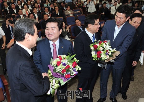 새누리당 김무성 대표와 김태호 최고위원이 14일 오전 서울 여의도 국회에서 열린 새누리당 의원총회에서 합의추대된 원유철 원내대표, 김정훈 정책위의장을 축하하고 있다.