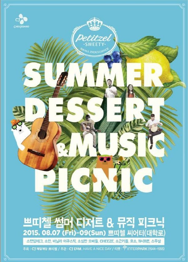 무더운 여름, 고품격 디저트와 라이브 음악을 함께 즐길 수 있는 세상에서 가장 달콤한 신개념 뮤직피크닉 ‘쁘띠첼 썸머 디저트앤뮤직 피크닉’ (이하 쁘띠첼썸디피)이 오는 8월 7일부터 3일간 대학로 쁘띠첼씨어터에서 열린다.이번 ‘쁘띠첼썸디피’는 ‘Urban Picnic(도심 피크닉)’이라는 콘셉트에 맞게 공연장을 푸른 잔디밭과 피크닉 공간으로 꾸민다. 공연장으로 들어서는 순간부터 마치 멀리 여행을 떠나온 듯한 설렘을 안겨줄 것으로 보인다.쁘띠첼썸디피 예매자 전원에게는 스페셜한 쁘띠첼 디저트 박스를 제공해 공연을 감상하며 동시에 달콤한 디저트도 함께 즐길 수 있다. 쁘띠첼썸디피는 일상에 지친 도시민들에게 멀리 떠나지 않아도, 가까운 도심 속에서 여유로움과 힐링을 제대로 만끽할 수 있는 색다른 경험을 제공할 전망이다.쁘띠첼썸디피를 더욱 달달하게 만들어줄 라인업은 디저트만큼이나 달콤하다. 음원차트를 석권한 스탠딩에그를 비롯해, 홍대 밴드씬을 대표하는 소란, 각종 드라마 OST를 통해 꾸준히 사랑 받고 있는 바닐라 어쿠스틱, SNS에서 38만 팔로워를 보유하고 있는 소근커플, 11시 11분, 호소, 소심한 오빠들, 스무살, CHEEZE 공연까지 3일간 총 9팀이 도심 한가운데서 즐기는 피크닉 분위기를 더해줄 예정이다.특히, 이번 쁘띠첼썸디피 라인업은 오는 9월 새롭게 선보이는 페스티벌인 ‘해브 어 나이스 데이 Have A Nice Day’(이하 H.AN.D)의 프리쇼의 성격을 지니고 있기도 하다. 이미 대중에게 익숙한 멜로디와 음악성으로 인정받지만 좀처럼 라이브 무대를 만나보기 힘들었던 아티스트들의 대거 출연으로 벌써부터 많은 음악팬들의 기대를 모은다.‘쁘띠첼썸디피’는 8월 7일부터 3일간 진행되며 900매 한정으로 티켓을 오픈하며, 오는 7월 20일 오후 2시부터 인터파크에서 예매할 수 있다. 티켓 구매자 전원에게 쁘띠첼 디저트박스를 증정한다.[쁘띠첼 썸머 디저트 & 뮤직 피크닉 포스터, 사진=CJ E&M]