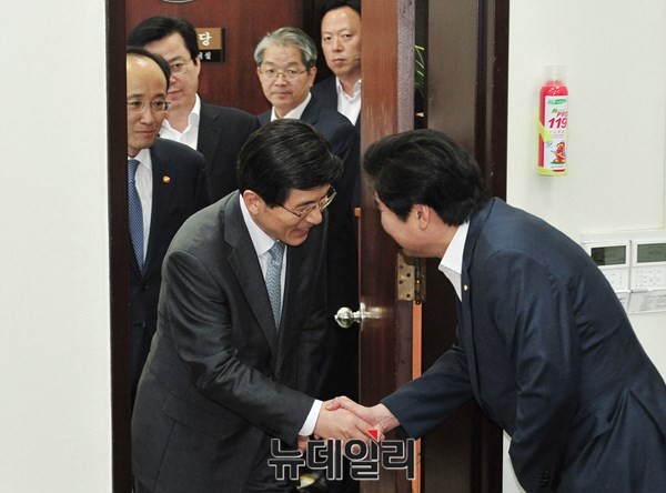 원유철 새누리당 원내대표가 16일 오후 서울 여의도 국회 새누리당 원내대표실을 예방한 황교안 국무총리와 악수를 나누고 있다.