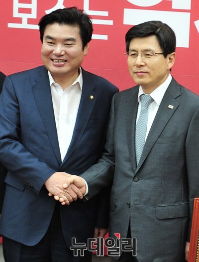 원유철 새누리당 원내대표가 16일 오후 서울 여의도 국회 새누리당 원내대표실을 예방한 황교안 국무총리와 악수를 나누고 있다.