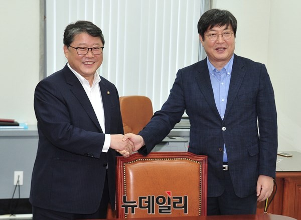 새누리당 조원진 원내수석부대표와 새정치민주연합 이춘석 원내수석부대표가 6일 오후 서울 여의도 국회 새정치민주연합 원내수석부대표실에서 만나 인사를 나누고 있다.