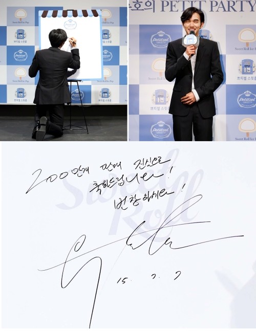 배우 유승호의 상남자 향기가 물씬 나는 손글씨가 화제다.쁘띠첼의 광고모델로 활동하고 있는 유승호는 앞서 '쁘띠첼 200만개 판매돌파 기념 팬미팅'에서 팬들을 위해 자필 축하 멘트와 사인을 공개했다.이날 유승호는 전국 각지에서 유승호를 보기 위해 모인 팬들을 위해 축하 멘트를 써달라는 MC의 요청에 설치된 사인용 보드판이 자신의 키 보다 낮아 잠시 머뭇거렸다. 하지만 이내 무릎을 꿇은 채 한자 한자 써 내려가는 과감한 팬 서비스를 보였다.특히, 글씨를 못 쓴다며 쑥스러워하면서도 팬들을 위해 보드판 위에 시원시원한 상남자 다운 손 글씨를 남겨 현장에 모인 팬들의 마음을 설레게 했다.팬들은 무대 위에서 무릎을 꿇고 사인을 남기는 유승호의 뒷모습을 보며 "팬을 위해서라면 무릎 꿇고 사인을 남겨주는 모습이 인상적이었다", "부드러운 모습만 기억했는데, 어엿한 상남자 냄새가 느껴졌다"며 뜨거웠던 현장 분위기를 전했다.[유승호 손글씨, 사진=CJ제일제당 쁘띠첼]