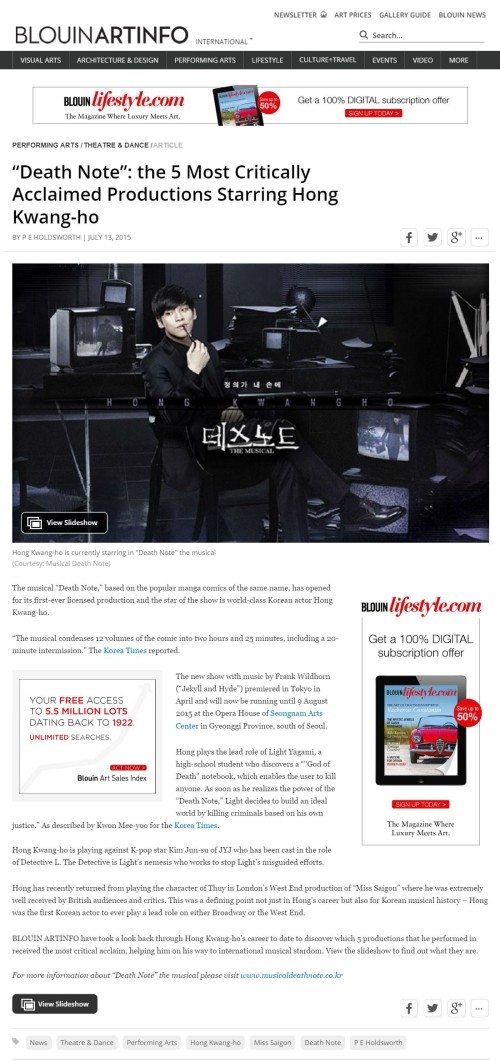 뮤지컬 '데스노트'에서 열연 중인 배우 홍광호가 영국 유력 웹진 '블루인 아트인포(Blouin Artinfo)'으로부터 호평을 받았다.지난 13일 전세계 19개국에서 발행하는 아트계의 세계적인 웹진 '블루인 아트인포'는 홍광호가 출연하고 있는 뮤지컬 '데스노트'를 집중적으로 다루며 Performing Arts 섹션 메인을 장식했다.'블루인 아트인포'는 홍광호를 '세계 최고 수준의 한국 배우'(world-class Korean actor)'이며 그가 웨스트엔드에 진출한 최초 한국인 배우로서 '미스사이공'의 튜이 역을 완벽하게 소화해냈다고 소개했다.이어 그가 영국 관객들과 비평가들의 극찬을 받고 돌아온 것은 "홍광호 개인의 경력뿐만 아니라 한국 뮤지컬 역사에도 한 획을 긋는 일이었다(This was a defining point not just in Hong’s career but also for Korean musical history)"고 평했다.특히, 평론가들의 찬사를 받았던 5편의 대표작 '스위니토드', '지킬앤하이드', '맨오브라만차', '오페라의유령', '미스사이공(영국)'을 집중 분석해 보도하며 "홍광호가 세계적인 뮤지컬 아티스트로 거듭나길 응원한다"고 전했다.한편, 홍광호가 라이토 역으로 출연하고 있는 뮤지컬 '데스노트'는 8월 15일까지 성남아트센터 오페라하우스에서 공연된다.