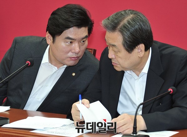 김무성 새누리당 대표가 16일 오후 서울 여의도 국회 당대표실에서 열린 최고위원회의에서 원유철 원내대표와 대화를 나누고 있다.
