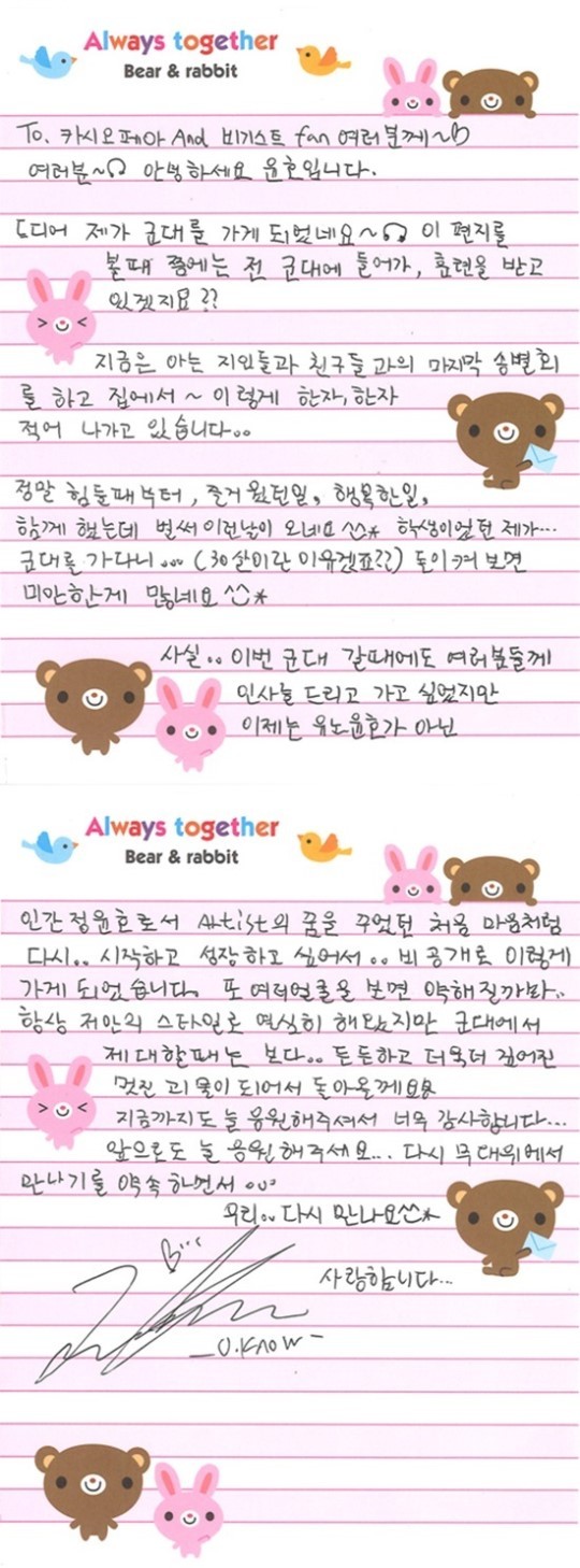 21일 조용히 26사단 신병교육대로 입소한 동방신기의 유노윤호가 팬들에게 '자필 편지'를 남긴 것으로 전해져 화제다.