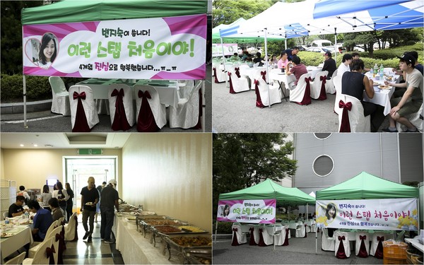'가면' 수애가 제작진을 위해 만찬을 준비해 화제다.수애는 최근 SBS 수목드라마 '가면'(극본 최호철, 연출 부성철 남건)의 제작진을 위해 화장품 세트를 선물한데 이어, 21일 정성 가득한 깜짝 뷔페를 마련했다.특히 이번 뷔페에서는 수애가 직접 아이디어를 낸 문구가 등장해 더욱 눈길을 끌었다. 현수막에 '변지숙이 쏩니다! 이런 스탭 처음이야! 4개월 진심으로 행복했습니다'라는 문구가 바로 그것이다.'가면'의 한 관계자는 "수애씨가 빠듯한 스케쥴을 소화하는 와중에도 그동안 동고동락을 같이한 동료배우분들, 그리고 스태프분들을 잊지 않고는 이 같은 깜짝 뷔페를 제공했다”라며 “그녀의 마음 씀씀이에 모두들 다시한번 고마워하며 여유롭고도 든든하게 식사했고, 덕분에 마지막까지 최선을 다할 힘이 생겼다"라며 엄지손가락을 치켜세우기도 했다.한편 수애는 '가면에서 극중 변지숙과 서은하 1인 2역을 맡아 열연을 펼치고 있다. '가면'은 자신을 숨기고 가면을 쓴 채 다른 사람으로 살아가는 여자와 그 여자를 지고지순하게 지켜주는 남자를 통해 진정한 인생과 사랑의 가치를 깨닫는 격정 멜로드라마다. 오는 22일 밤 10시에 17회가 방송된다.