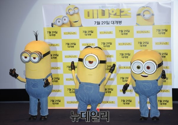 영화 '미니언즈'에 VIP시사회에 앞서 주인공인 세 미니언들이 미리 나와 다양한 포즈를 취했다.