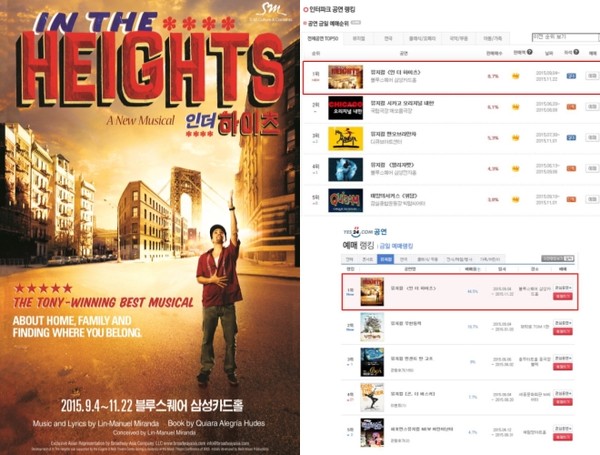 브로드웨이 라이선스 뮤지컬 '인 더 하이츠'가 23일 1차 티켓오픈과 동시에 예매사이트 인터파크와 예스24에서 랭킹 1위를 차지하며 성공적인 신호탄을 울렸다.뮤지컬 '인 더 하이츠'는 뉴욕의 라틴할렘이라 불리는 워싱턴 하이츠를 배경으로, 그 곳에 살고 있는 이민자들의 애환이 담긴 삶과 꿈을 긍정적인 유머로 승화한 작품이다.랩, 힙합, 스트릿 댄스 등 그 동안 뮤지컬 장르에서 좀처럼 시도되지 않았던 새롭고 실험적 도전으로 호평을 받으며 제62회 토니상 어워즈 최우수 뮤지컬상 포함 4개 부문 수상, 2009년 그래미어워즈 최우수 뮤지컬 앨범상을 수상하기도 했다.국내 초연무대에서는 떠오르는 차세대 뮤지컬 스타와 대중들의 큰 사랑을 받고 있는 실력파 아이돌의 대거 캐스팅 소식으로 화제를 모았다.하이츠에서 작은 가게를 운영하며 언젠가 고향에 돌아갈 것을 꿈꾸는 희망의 청년 '우스나비' 역에 양동근 정원영 키(샤이니) 장동우(인피니트)가, 니나의 아버지가 운영하는 콜택시 회사에서 일하며 니나와 사랑에 빠지는 '베니' 역에는 서경수, 김성규(인피니트) 첸(엑소)이 연기한다.또, 모든 남자들의 눈길을 사로잡는 아름다운 미용사 '바네사' 역에는 오소연, 제이민이 캐스팅 됐으며, 하이츠의 자랑이라 할 만큼 우수한 성적으로 대학교에 입학하지만 금전적이 문제로 학교를 그만두고 집으로 돌아오는 '니나' 역에 김보경과 루나(에프엑스)가 무대에 오른다.여기에 뮤지컬계 독보적인 흥행파워를 자랑하는 이지나 연출과 원미솔 음악감독, 채현원, 김재덕 안무가를 비롯한 막강한 크리에이티브팀의 참여로 흥행성과 작품성을 입증시키며 올 하반기 최고의 기대작으로 떠올랐다.뮤지컬 '인 더 하이츠'는 8월 12일까지 조기예매 시 20% 할인이 적용되며, 오는 9월 4일 블루스퀘어 삼성카드홀에서 개막한다.